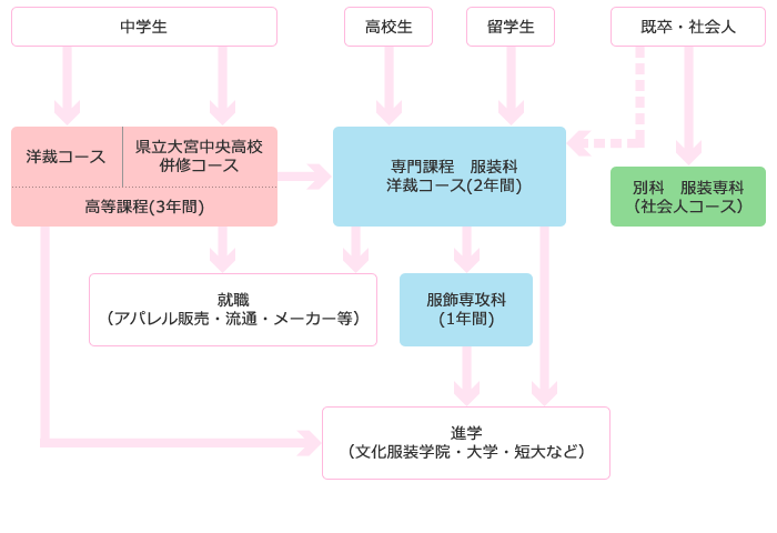 専門課程を卒業後、さらなるスキルアップを目指したい方には、1か年の服装専攻科をご用意。また、連鎖校として文化服装学院への推薦も可能です。